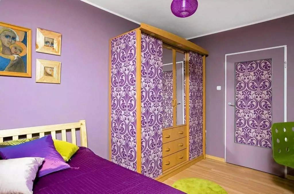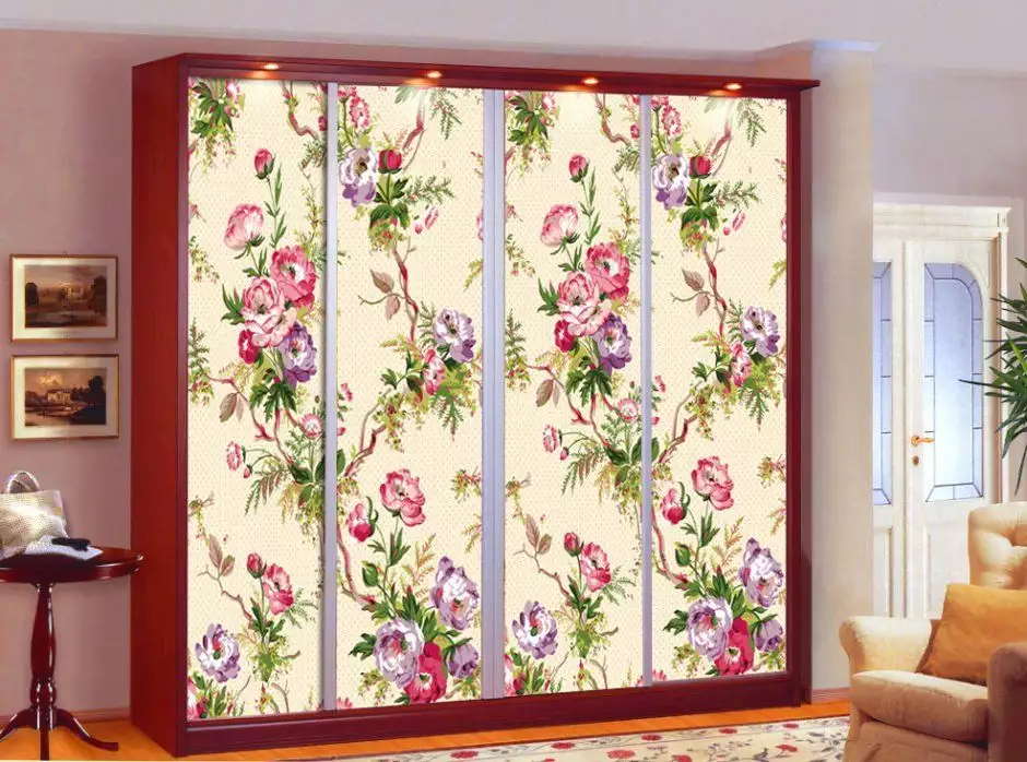 Pokud si vezmete tapetu do kuchyně, bude to pohodlnější, protože takovou tapetu lze snadno umýt. Látková skříň se bude trochu hůře čistit. Je žádoucí, aby vzor a barva na materiálu, kterým bude skříň pokryta, zapadaly do designu místnosti. Samotný proces lepení je jednoduchý: tapetu nebo látku je potřeba nastříhat na proužky, nanést lepidlo na povrch skříně (můžete použít PVA), nanést materiál a přejet válečkem pro vyhlazení. Můžete si vzít vícebarevné pruhy látky nebo tapety: například na jedny dveře nalepte materiál jedné barvy a s jedním vzorem a na druhé jiné barvy nebo s jiným vzorem. Získáte tak zajímavý téměř designový šatník ve stylu shabby chic. Skříň můžete obložit i fototapetou. Vyrábějí se v tiskárně nebo se prodávají v železářství.