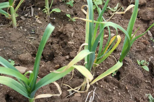 A pokud konečky peří cibulí často žloutnou kvůli nedostatečné zálivce, pak je tomu u česneku kvůli nadměrné vlhkosti naopak.