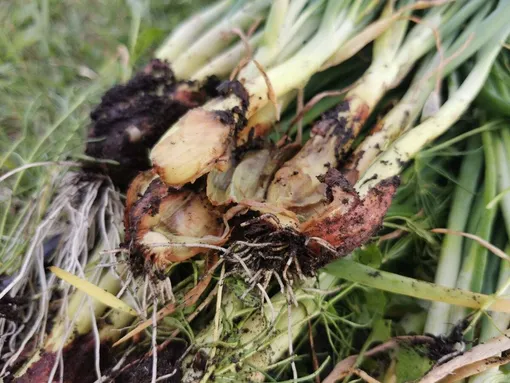2. Hnití spodní části cibule lze vyrovnat vyhrabáním půdy a uvolněním většiny plodů. V půdě by měly zůstat pouze kořeny.