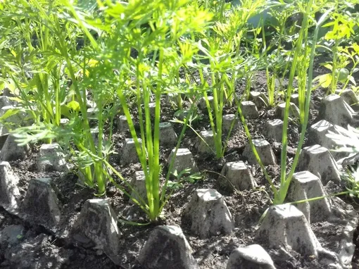 - Krabice se položí do připravené půdy a posypou. Do prohlubní je umístěn pár semen. Jak vidíte, byla vytvořena pohodlná vzdálenost pro normální růst mrkve.