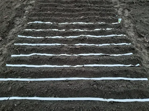 - Po zaschnutí pásky je třeba ji nakrájet na proužky, umístit do připravených drážek a posypat zeminou. Jinak se metoda neliší od klasické verze.